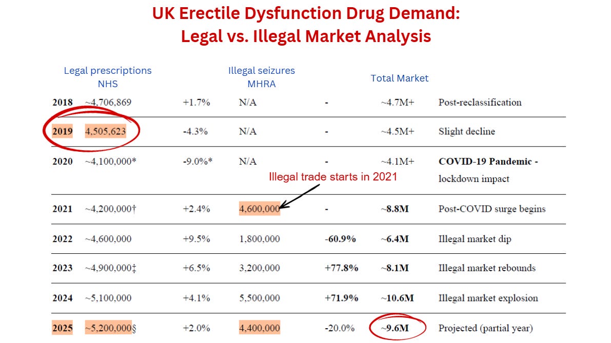 From 2009 to 2019, legal prescriptions for erectile dysfunction medications grew steadily from 2.1 million to about 4.5 million annually. This was a gradual, predictable increase of roughly 110% over ten years. During this entire period, illegal seizures were negligible. The market was essentially “not applicable” because people were comfortable going to their doctors for prescriptions. This suggested an older, more mature cohort who had no issue seeking medical help.
